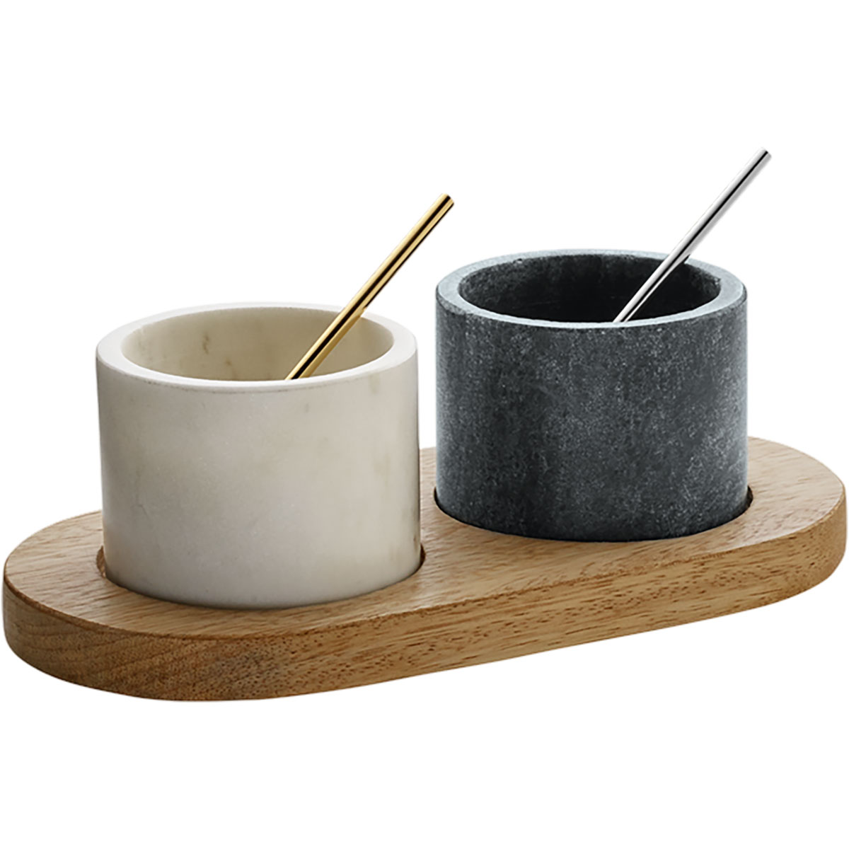 Litet set med två marmorskålar på en träbricka, skedarna ingår. Varje skål rymmer 17cl och passar bra till kryddor eller andra tillbehör. Lika fin att sätta fram på bordet som att ha vid sidan av spisen. Både marmor och trä är naturmaterial som måste diskas för hand.