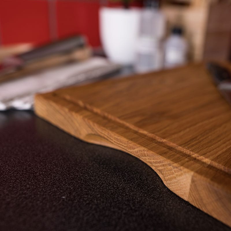 Oljad skärbräda med handtag och skåra i träslaget ek.