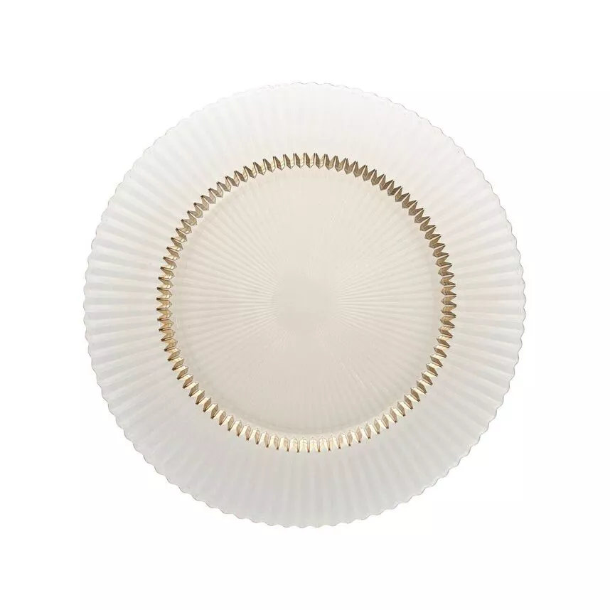 Stor, plan glastallrik i varm gul ton. Passar utmärkt för uppläggning, servering eller som dekorativ detalj på bordet.