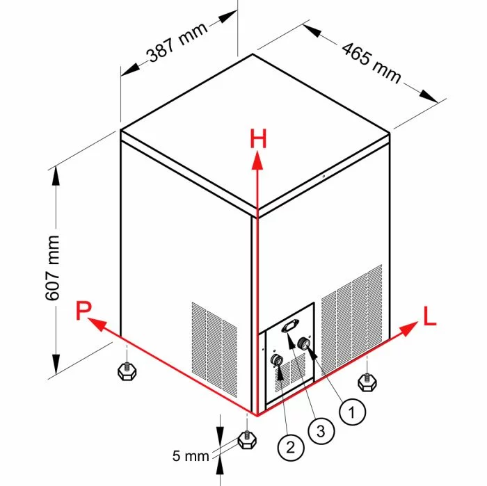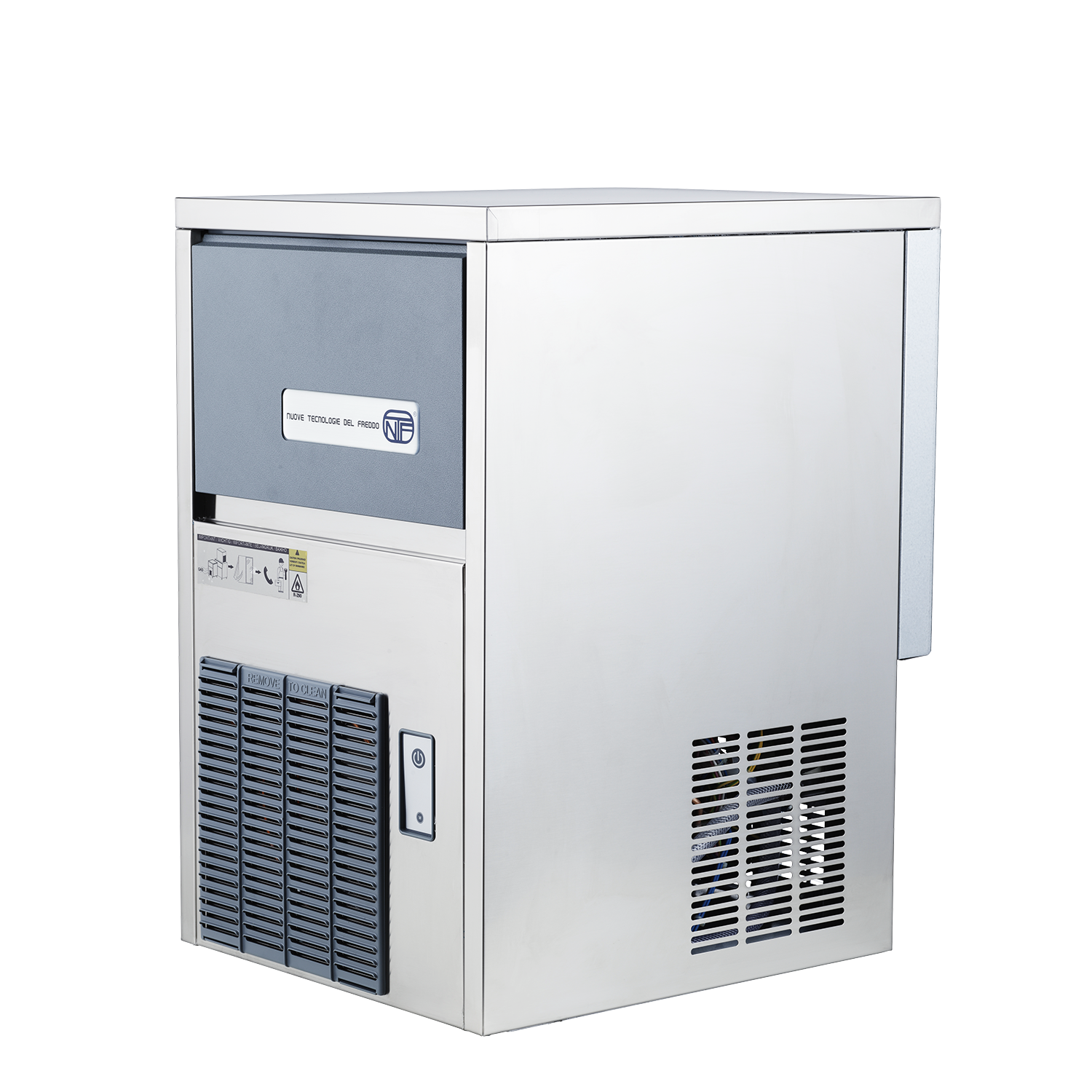 Stor iskubmaskin från NTF som har en driftsäker konstruktion och hög kvalitét. Kapaciteten på denna maskin är 26kg is/dygn och den håller 6kg is i lager. Iskubarna som produceras blir i klar och fin kvalitet, de väger 17gram och har ett mått på 3,5×3,1cm. Ismaskinen är vattenkyld och kan byggas in under köksbänk så länge det finns tillgång till ventilation, avlopp och vatten.