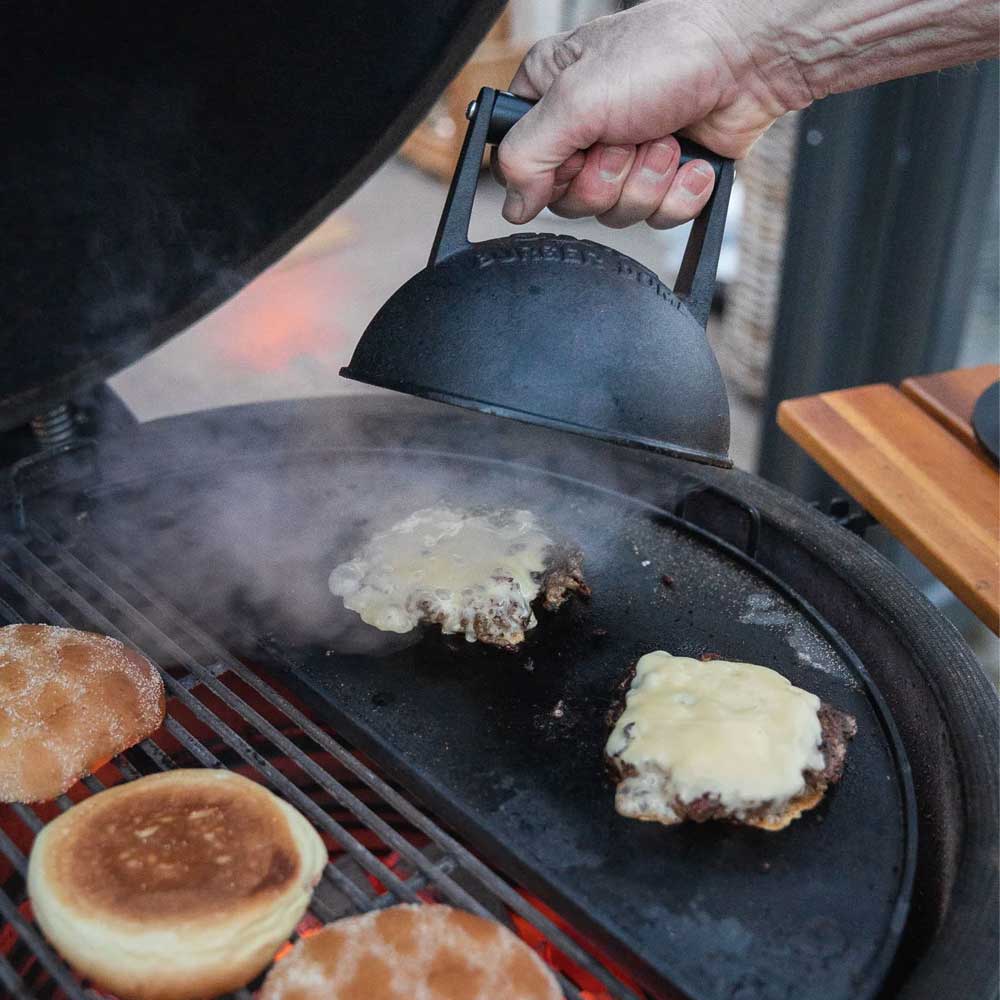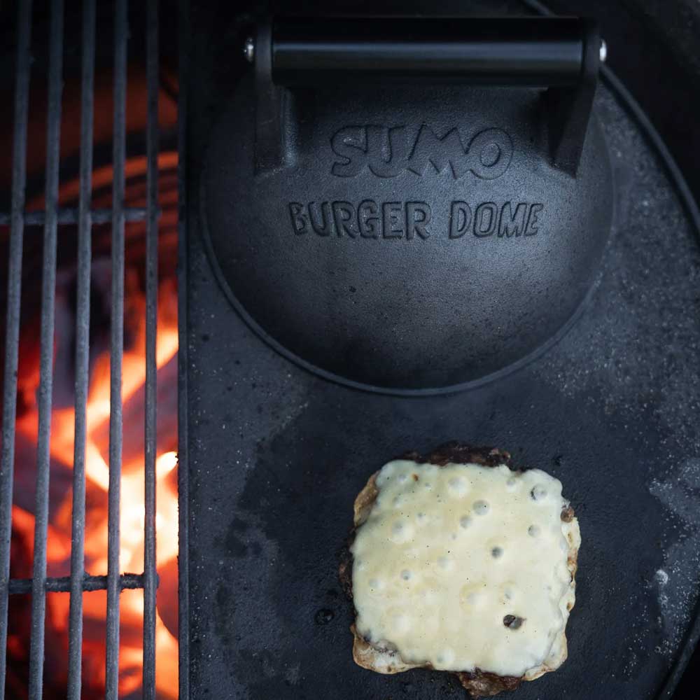 Kamado Sumos Burger Dome är en smältkupol som låter värmen koncentreras under kupolen för att smälta osten till perfektion och tillaga dina burgare både snabbare och jämnare. Placera kupolen över dina burgare för att fånga och ingjuta smakerna av rök och eld medan osten smälter och lägger sig som ett tjockt täcke över burgaren på det sätt som vi alla älskar.