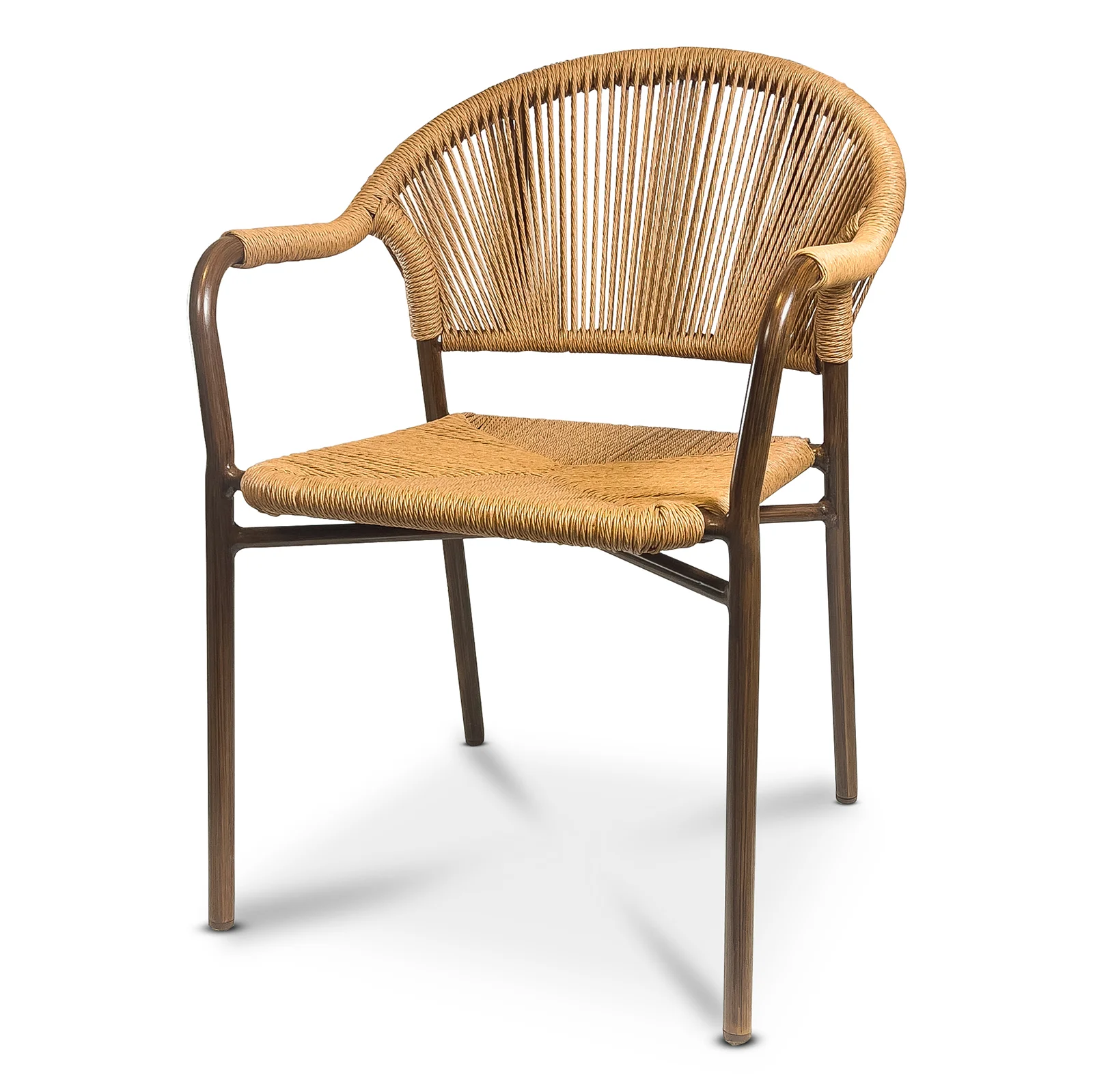 Karmstol Nantes är en nätt utomhusstol med rundat ryggstöd för hög komfort och en rustik design. Den bruna aluminiumstommen gör stolen lätt att hantera, medan sitsen i naturnära fiberrotting ger ett slitstarkt och stilrent intryck som påminner om flätat rep.