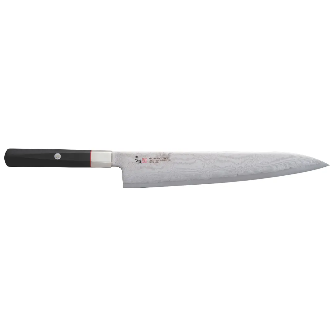 Denna gyuto (kockkniv) ur serien Hybrid Splash har ett rejält 24 cm långt blad med en kärna av VG-10-stål och 32 lager damaskusstål. Den generösa längden och den konvexa Hamaguri-slipningen gör den idealisk för att hantera större råvaror med kraft och precision, samtidigt som det ergonomiska handtaget i pakkawood ger ett stabilt grepp.