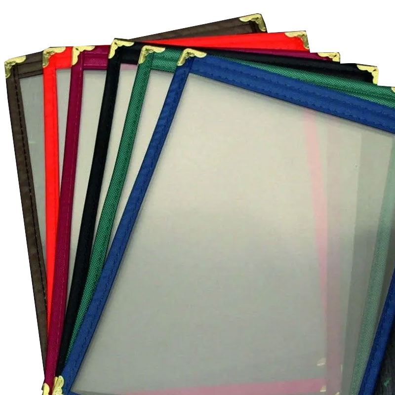 Menymapp A4 med grön nylonram och hörn i mässing. PVC fönster i högsta kvalitet.