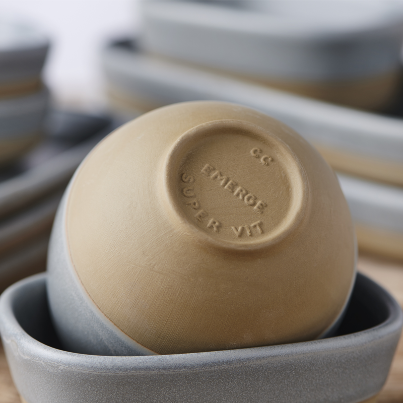 Emerge är en serie keramik som inspirerats av traditionell studioproduktion. Delarna har en reaktiv glasyr som ger naturliga skiftningar i färg och mönster, vilket gör att varje produkt får sitt eget unika utseende. Den exponerade foten i lertonsfärg ger en jordnära känsla och kontrast mot glasyrerna. Serien finns i tre färger – Oslo Blue, Seattle Grey och Cinnamon Brown – och är tillverkad i Churchill Super Vitrified för att klara både vardagsbruk och servering vid speciella tillfällen.