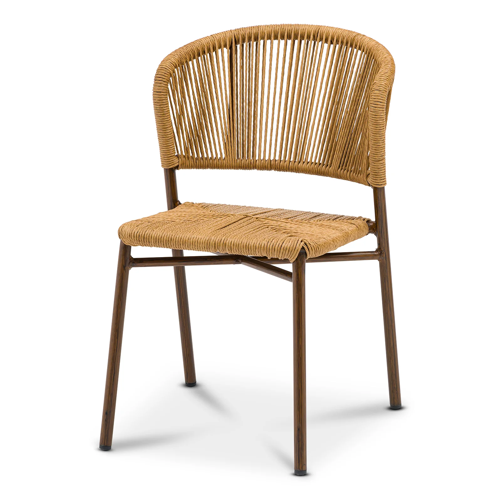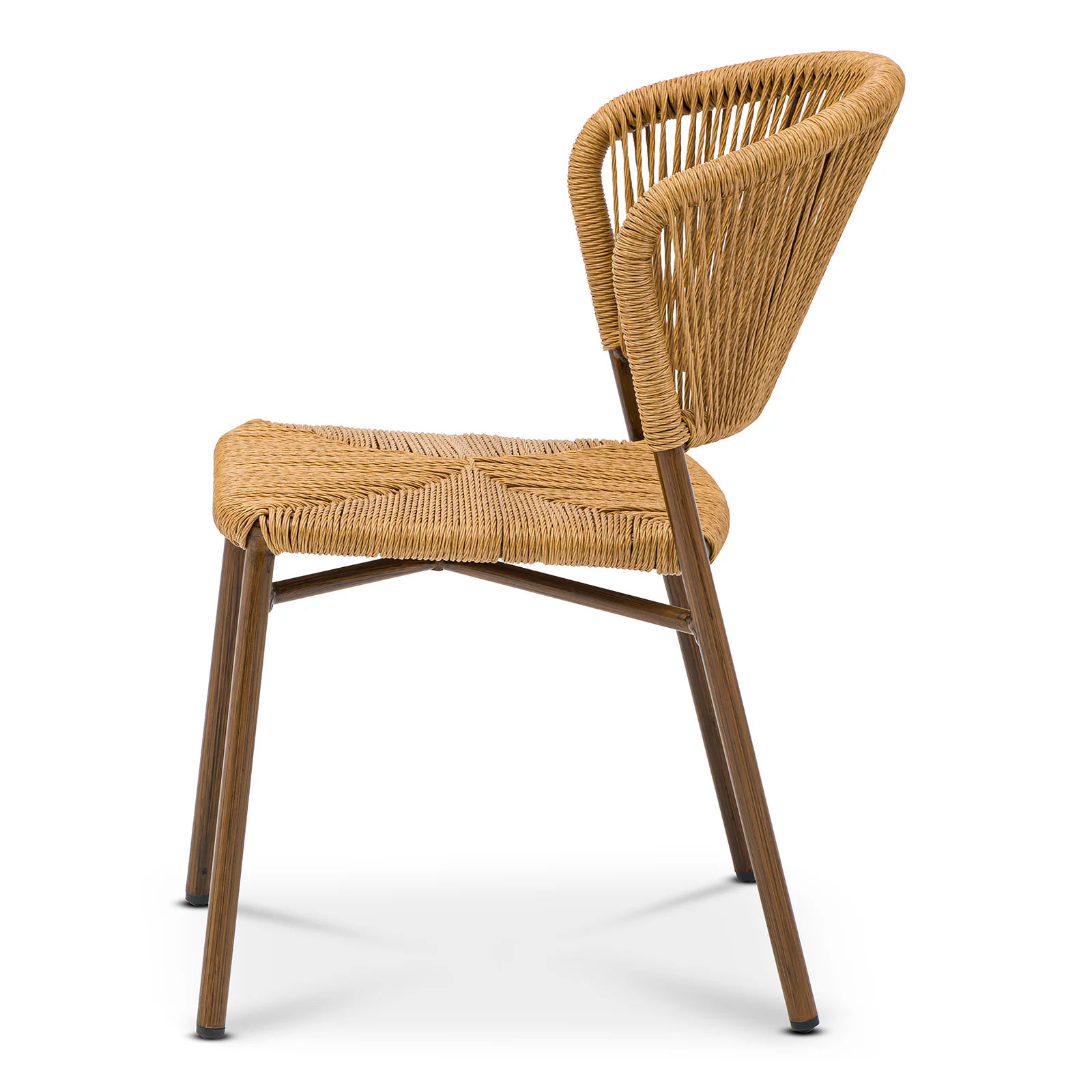 NantesStol Nantes är en nätt och stapelbar utomhusstol med ett rundat ryggstöd för hög komfort. Den har en brunlackerad aluminiumstomme med trä-look och kryssförstärkning för extra stabilitet, medan sitsen i slitstark fiberrotting ger ett naturligt och rustikt intryck.