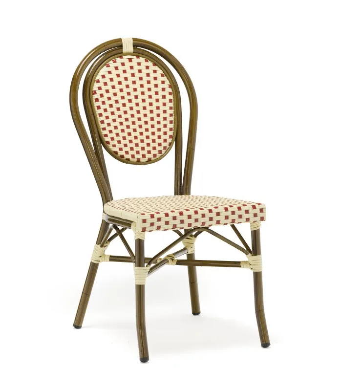 ParisStol Paris I är en klassisk utomhusstol i creme-vinröd konstrotting med en robust aluminiumstomme i bambu-look. Den är byggd för intensiv användning i offentlig miljö och är praktiskt stapelbar upp till 8 stycken.