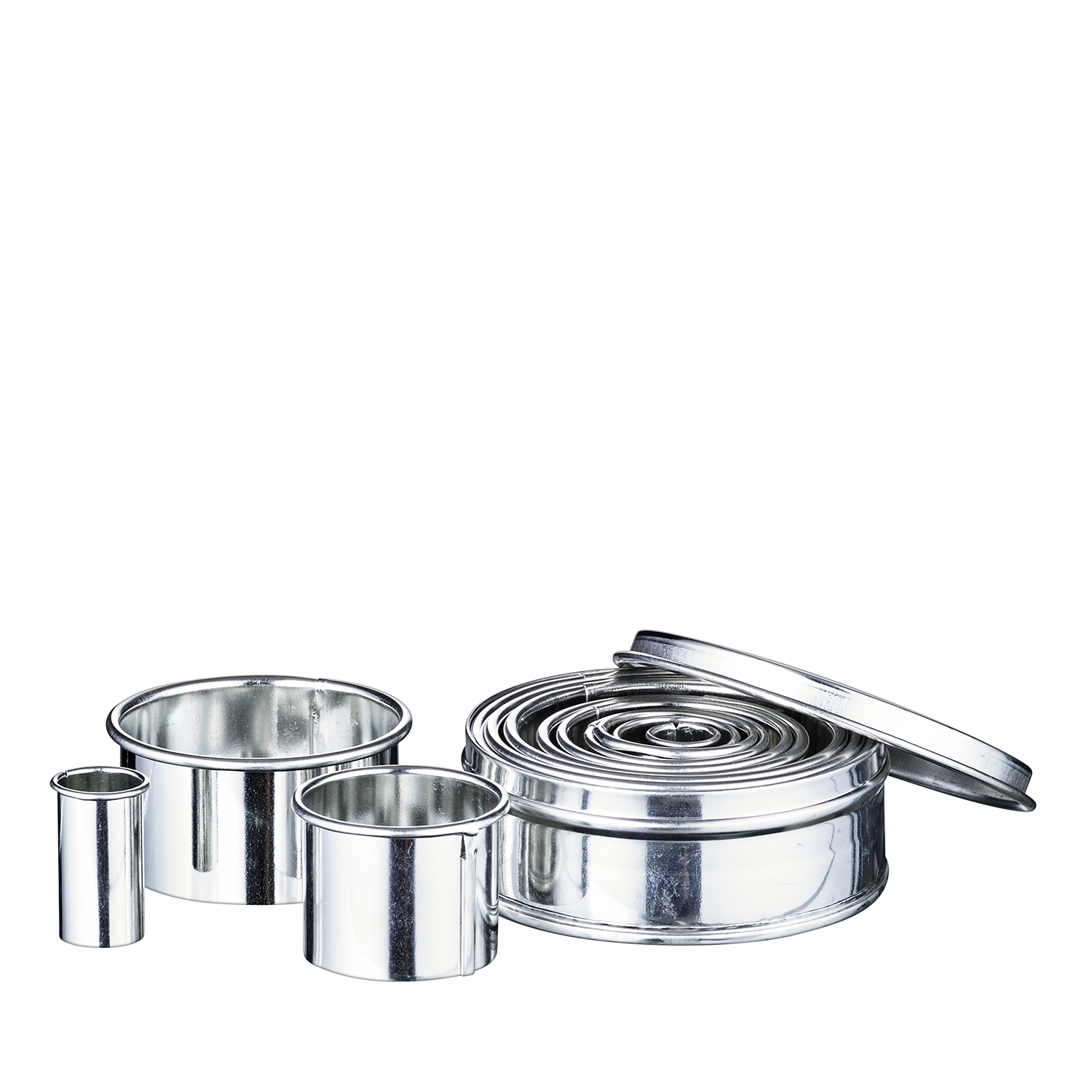Set med 10st utstickare för att göra cirklar i storlekarna 24, 36, 48, 60, 72, 84, 96, 110, 125 och 140 mm. Utstickarna är tillverkade i rostfritt stål och har en slät nedre kant. Används för att trycka ut cirklar av bröd, kakdeg, marsipan och sockerpasta.